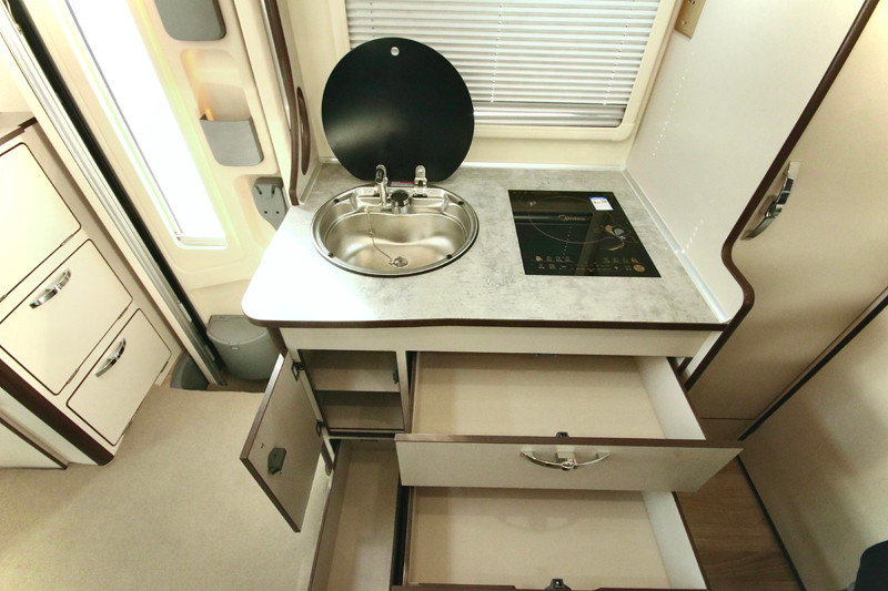 操作台面上集成有圆形不锈钢洗菜池,洗菜池带有玻璃盖板,右侧是一台电磁炉。上方设计一个微波炉。在厨房区域设计更多的储物柜,更好的收纳厨房用具。
