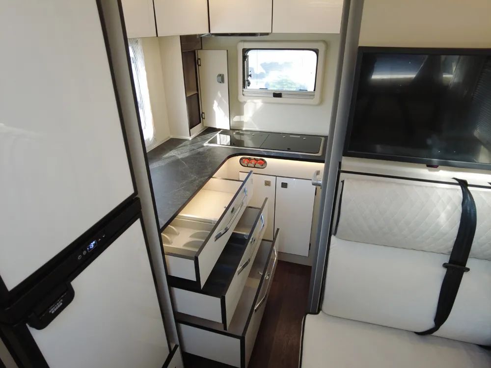 自动挡+四驱+后桥差速锁+房车专用底盘+准牵质量……丰富的使用场景,让房车生活更加多彩。 自由炮多布局可选,满足不同家庭的使用需求,那拥有大厨房,贯通储物仓的自由炮A是不是你的理想型呢? 自由炮A为前大额头床+中部客厅区+后置厨卫区布局。 生活区前部为1950*1700mm的额头大床,三面环窗,采光和通风效果良好,舒适的休息环境为旅行保证充沛的精力。 客厅区域常规状态为可容纳4人的卡座沙发+餐桌,也可灵活变成一张1700×900mm的床位,大尺寸的侧窗在旅途中可以欣赏美景。 厨房区为L型桌面,靠近车尾一侧配备了灶具和洗菜池,车辆标配85升冰箱,也可以配两台76升英得尔冰箱(152升)叠加。 客厅区及厨房区顶置吊柜,厨房区操作台下方抽屉储物功能强大。在车辆生活区尾部设置了贯通式行李舱,且在厨房下方设置了开口,结合车外两侧的可开启舱门,此储物仓具有三个取物口,使用便利! 固定式可旋转马桶、超大洗手盆、双向换气扇、外推窗、储物柜,设施齐全,使用方便。 强悍的车辆性能,舒适的格局,强大的储物能力,为旅行提供强有力的保障。 览众骆驼房车自由炮猛虎团招募进行中,名额有限,机遇难得!期待您的加入!